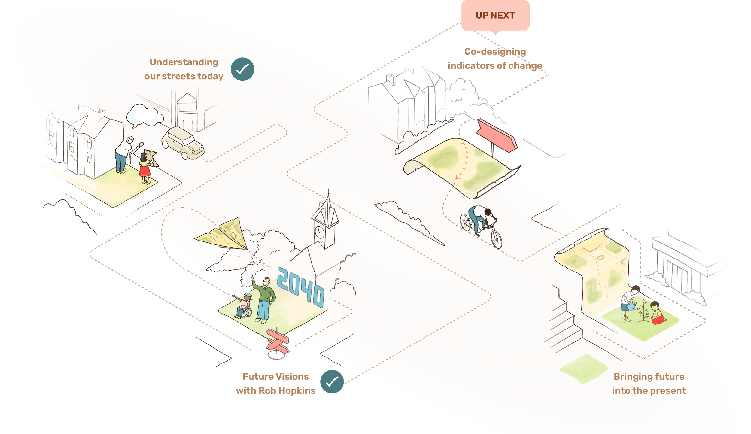 On the evening of 24th March, nearly 50 people from across Oxfordshire joined us online for the first Future Streets workshop. A reminder of our starting point for this series, and workshop 1 : that streets and neighbourhoods could support more people to really thrive. But what does that actually mean in Oxfordshire? Peter Lefort facilitated a session that moved between personal reflection and systems thinking, unpacking what matters most, what needs to change, and what the idea of thriving in our places means for those who live here.