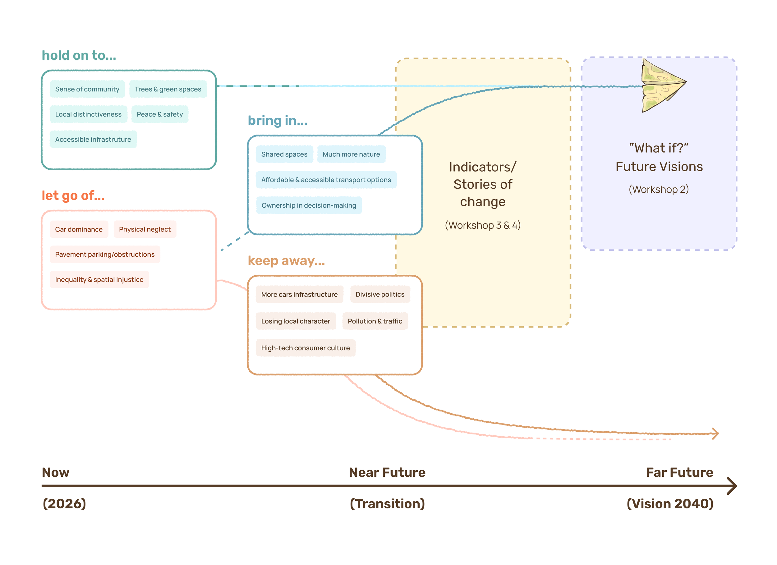 The insights from workshop 1 were shared with the participants to ensure everyone’s ideas are represented. In workshop 2, we worked on shared visions and “what-if?” questions for how our streets and neighbourhoods should work. Through more workshops and repeated feedback, this would help us create the stories of change from our current state to a desired one.